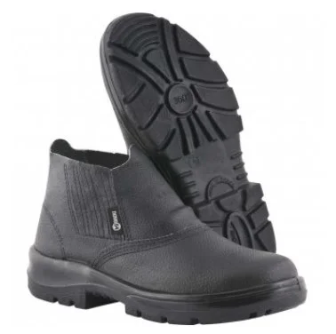 Botina de segurança confeccionada em couro vaqueta integral estampa relax, com elástico nas laterais. Possui o droso acolchoado, palmilha interna removível em EVA com tratamento antimicróbios. Indicada para serviços em áreas que apresentam riscos de natureza leve, uniformizando e garantindo conforto e proteção aos pés e tornozelos do usuário. BIQUIERA COMPOSITE